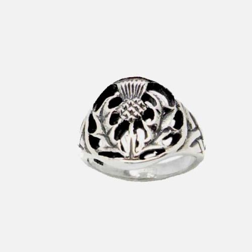Select this beautiful silver thistle dress ring - it's an openwork design and has lovely Celtic knotwork on the shoulders of the ring.