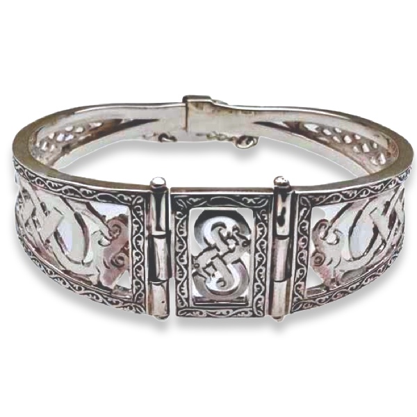 The Strontian sterling silver bangle was added to our range in 2014. This zoomorphic design features mythical Celtic beasts and is a substantial silver bangle. Please allow 15 working days to make, hallmark and dispatch your bangle